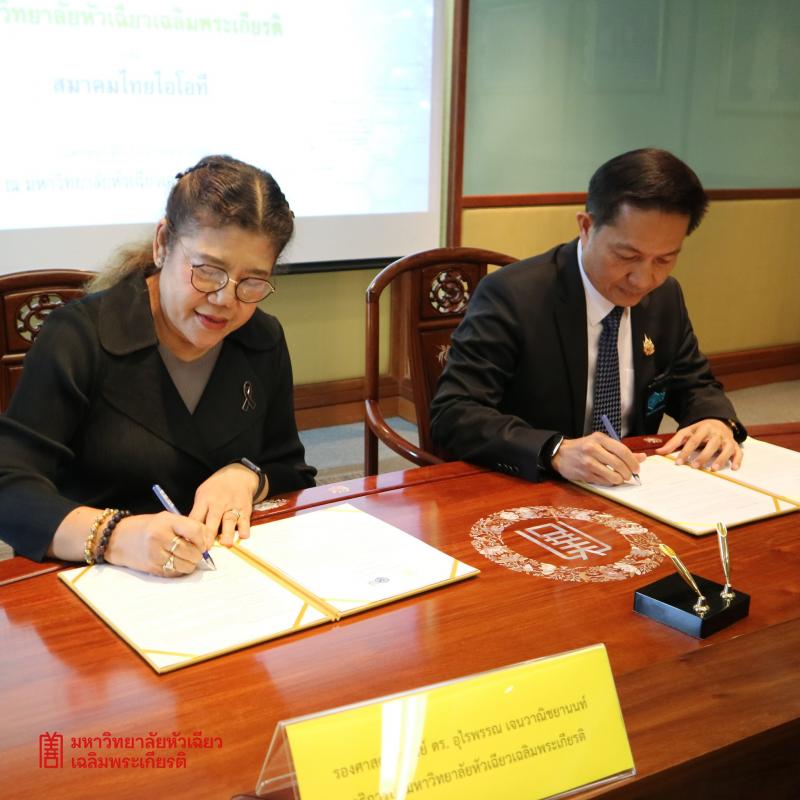 การลงนามครั้งนี้ได้รับเกียรติจาก รองศาสตราจารย์ ดร.อุไรพรรณ เจนวาณิชยานนท์ อธิการบดีมหาวิทยาลัยหัวเฉียวเฉลิมพระเกียรติ และ ดร.สุทัด ครองชนม์ นายกสมาคมไทยไอโอที เป็นผู้แทนลงนาม โดยมีเป้าหมายร่วมกันในการยกระดับศักยภาพด้านเทคโนโลยี การตลาด และการพัฒนาความเชี่ยวชาญในหลากหลายสาขา โดยเฉพาะด้านเฮลท์แคร์ (Healthcare) เทคโนโลยีด้านสุขภาพ (Health Tech) ซอฟต์แวร์ (Software) และงานวิจัย เพื่อสร้างความเชื่อมั่นด้านสุขภาพ ควบคู่กับการเชื่อมโยงเครือข่ายความร่วมมือให้เกิดประสิทธิภาพสูงสุด ทั้งนี้ มีผู้บริหารและคณาจารย์จากทั้งสองสถาบันร่วมเป็นสักขีพยานและแสดงความยินดี ได้แก่ อาจารย์ ดร.โจนาธาน รันเต คาริยอน รองอธิการบดี อาจารย์ ดร.จำรูญศรี พุ่มเทียน คณบดีคณะวิทยาศาสตร์และเทคโนโลยี คณาจารย์คณะวิทยาศาสตร์และเทคโนโลยี และ นายชาญศิลป์ ม้าทอง อุปนายกสมาคมไทยไอโอที พิธีลงนามจัดขึ้นเมื่อวันที่ 15 มกราคม 2569 ณ ห้องประชุม ชั้น 4 อาคารอำนวยการ มฉก.